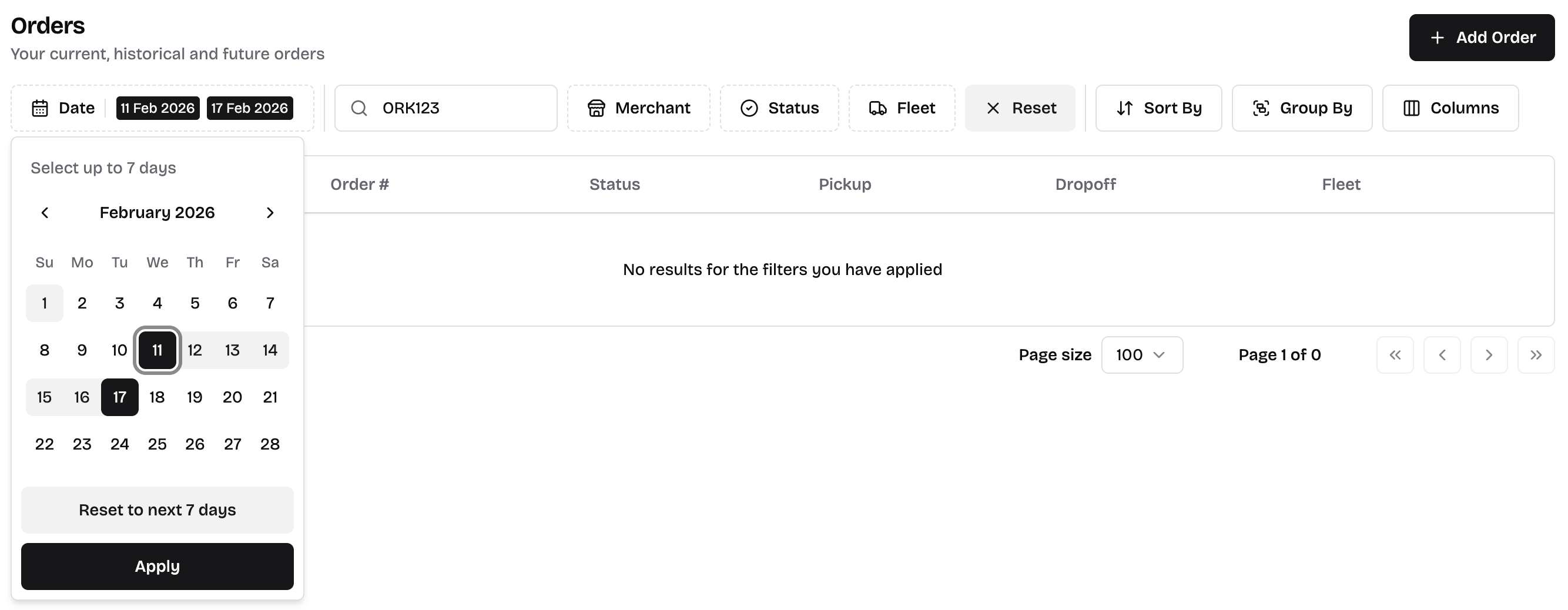 If you want to see a list of orders from a different time, for example, a week from the past, or a specific day in the future, you can change the Date filter.
